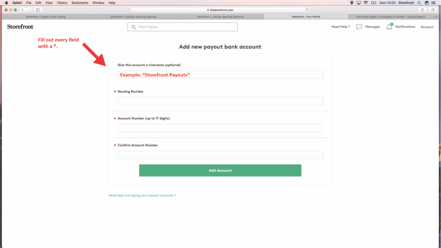 Vous devez configurer les informations clés du compte afin de recevoir des paiements via Space to Pop. Il est primordial que vous disposiez des informations sur votre compte car il s’agit d’une étape majeure vers la finalisation de l’inscription.