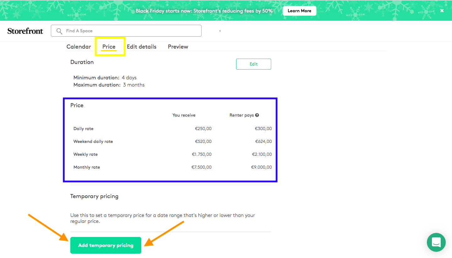 Vous avez deux types de tarifs. Le premier (souligné en bleu) correspond aux tarifs de votre espace, par ex. 1 500 € / semaine. « Ajouter une tarification temporaire » sert à définir des prix sur une période donnée (par ex. les semaines de mode, l'été, les fêtes…). Sélectionnez la période et indiquez le montant souhaité. Une fois enregistré, la plateforme actualise les prix en incluant notre commission de 20 %.