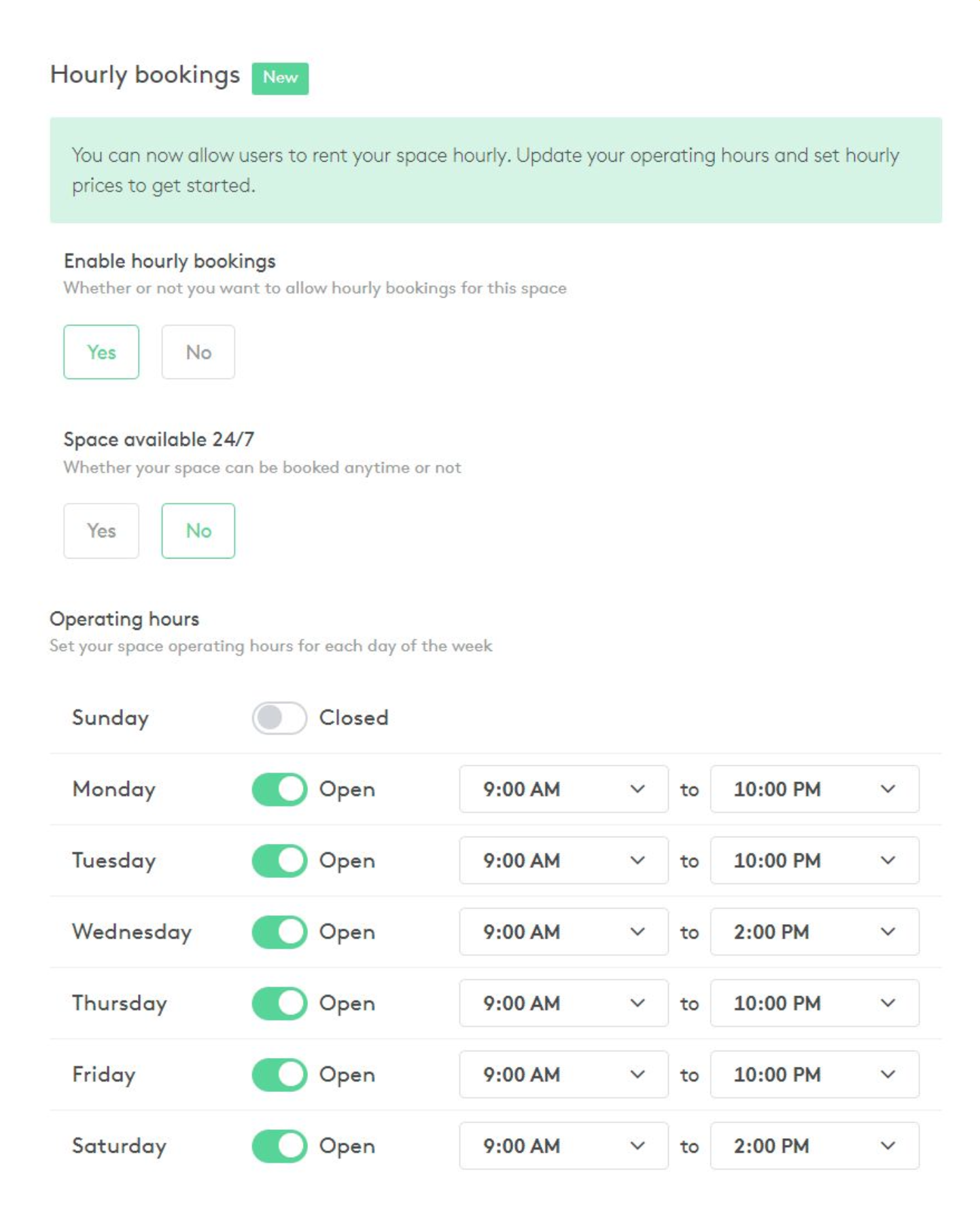 在那裡,您可以設定營業時間(可以按小時租用空間的時間)。