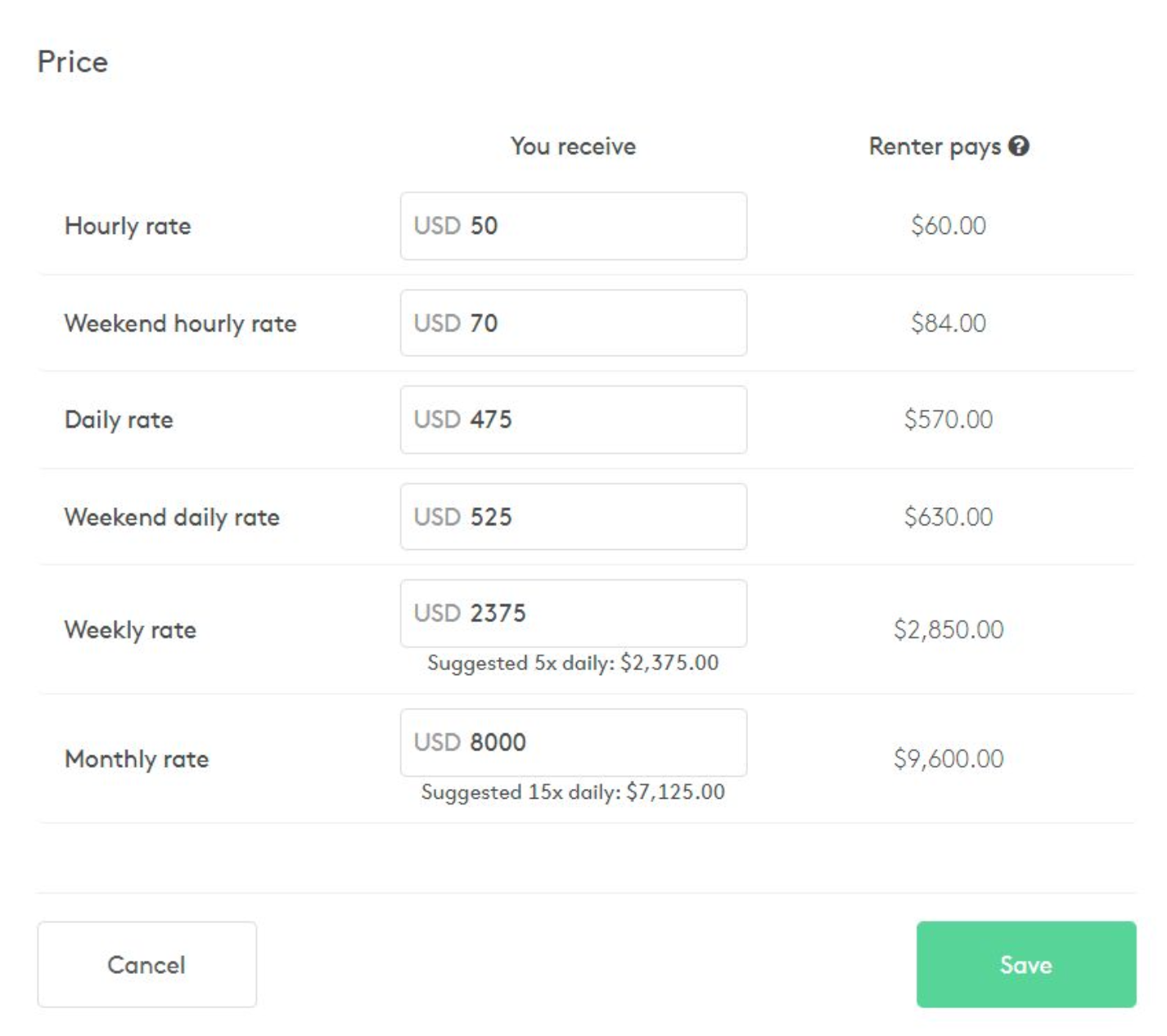 啟用按小時預訂功能後,需要在價格部分設定小時費率。