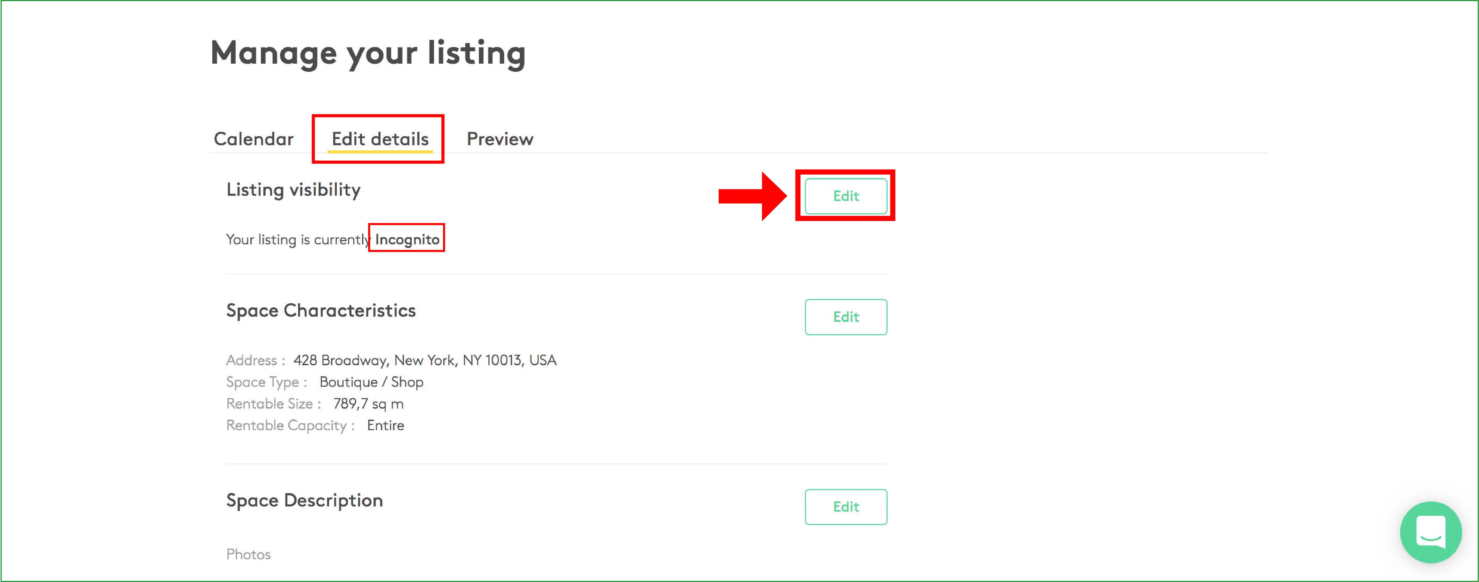 Ora puoi spostarti tra le diverse impostazioni di un annuncio. Per apportare modifiche alla "Visibilità dell'annuncio", rimarrai nella sezione "Modifica dettagli". Qui puoi vedere che "Il tuo annuncio è attualmente Incognito". Vuoi modificare lo stato di visibilità, quindi fai clic su "Modifica" come mostrato nello screenshot: