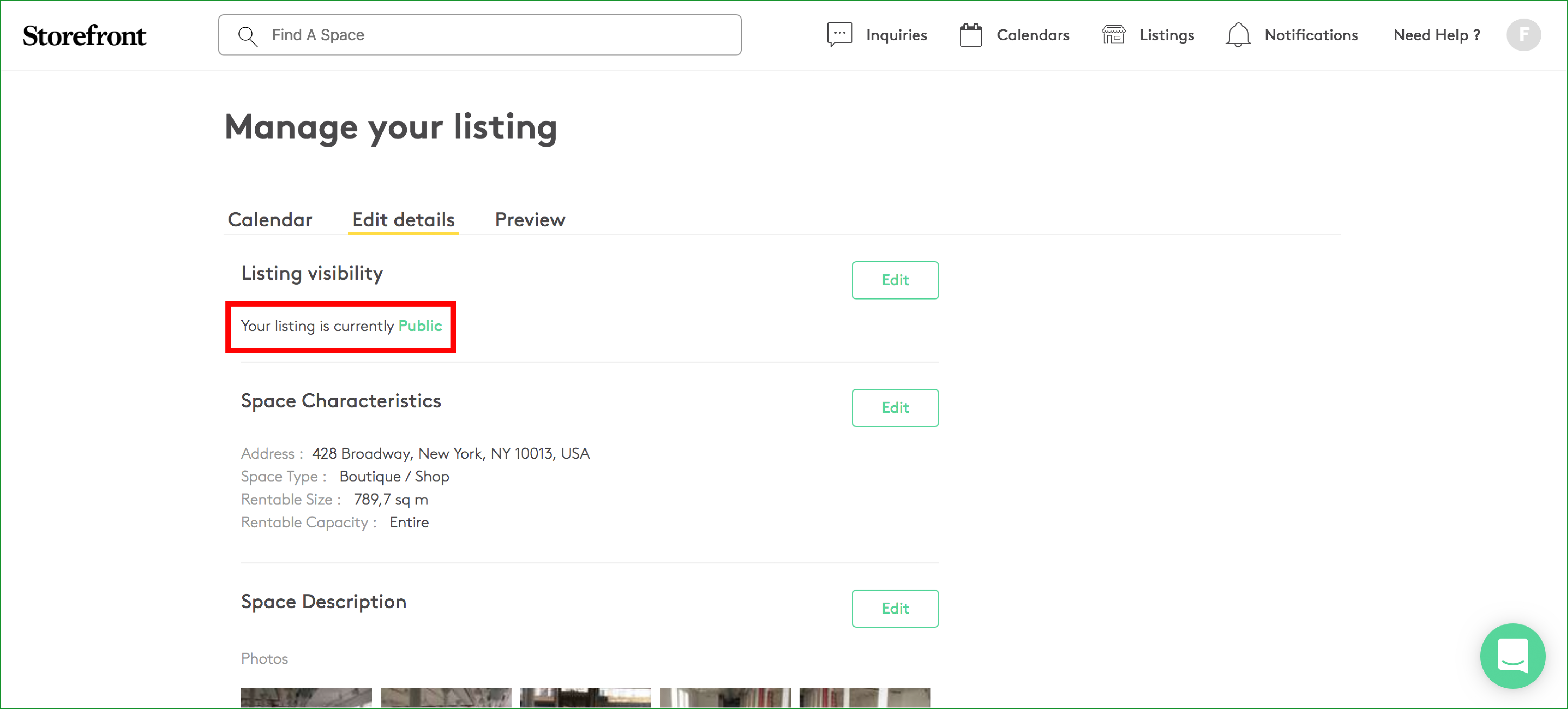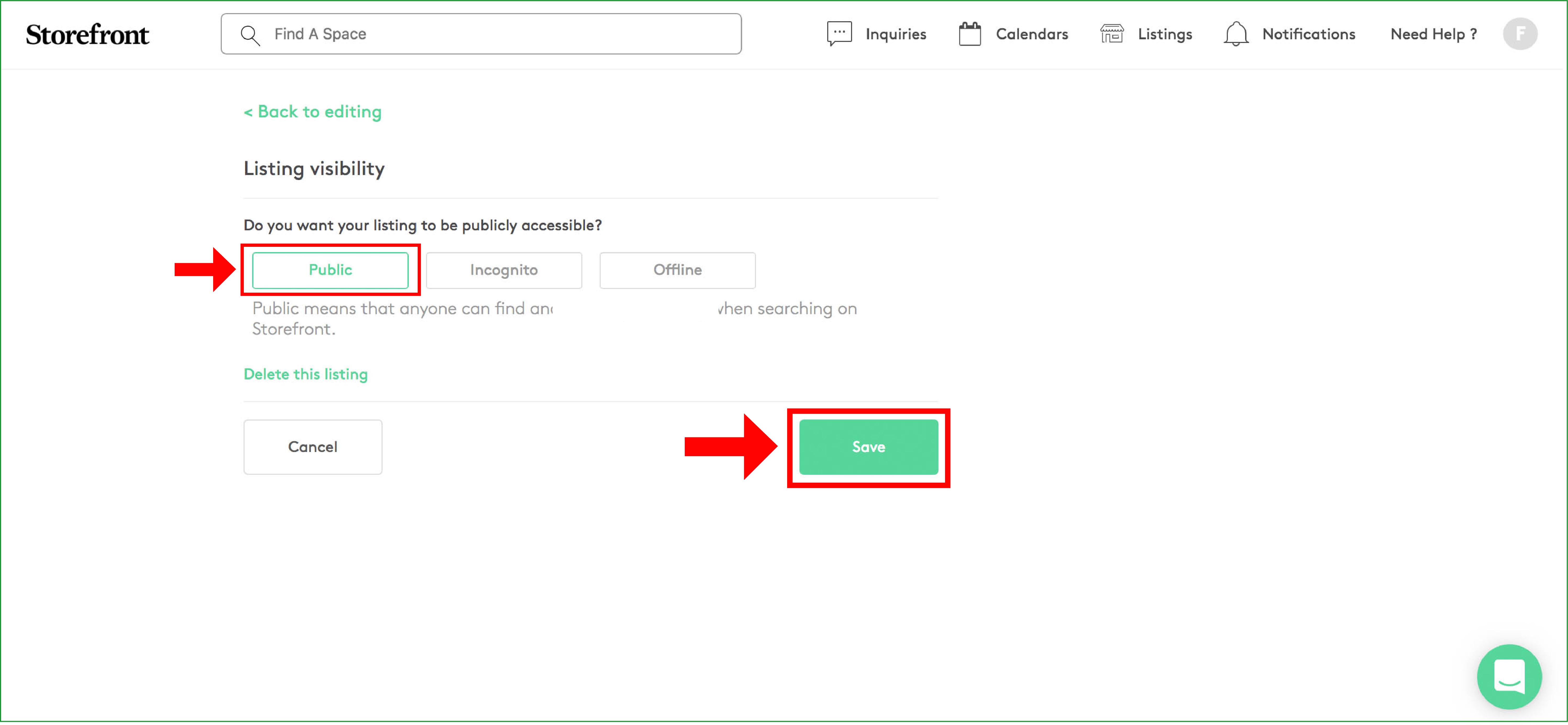 Hai ora modificato con successo lo stato di visibilità del tuo annuncio. Invece di essere un annuncio "Incognito", è ora "Pubblico" e completamente visibile a oltre 100.000 brand e retailer globali che cercano spazio tramite Storefront.